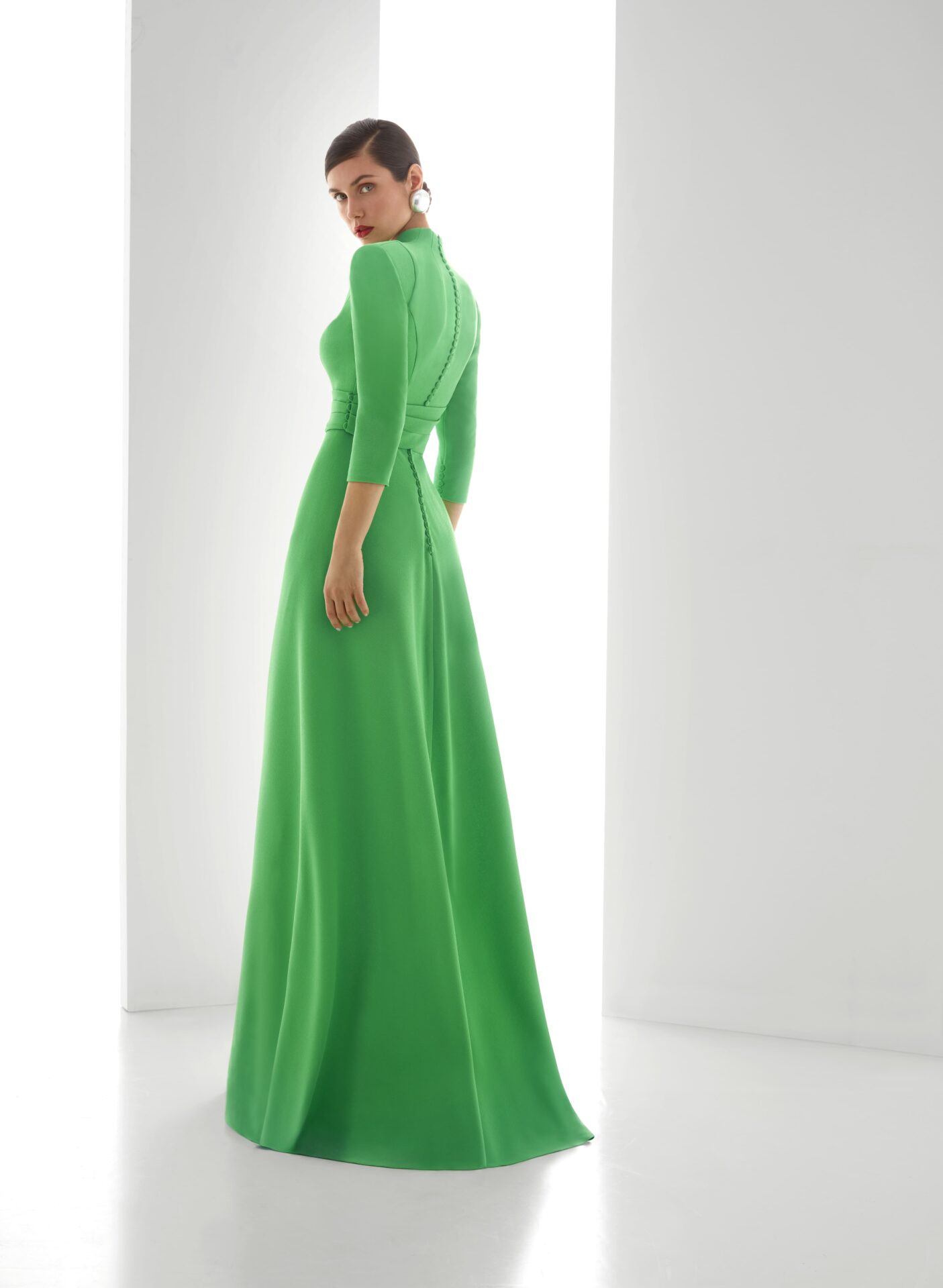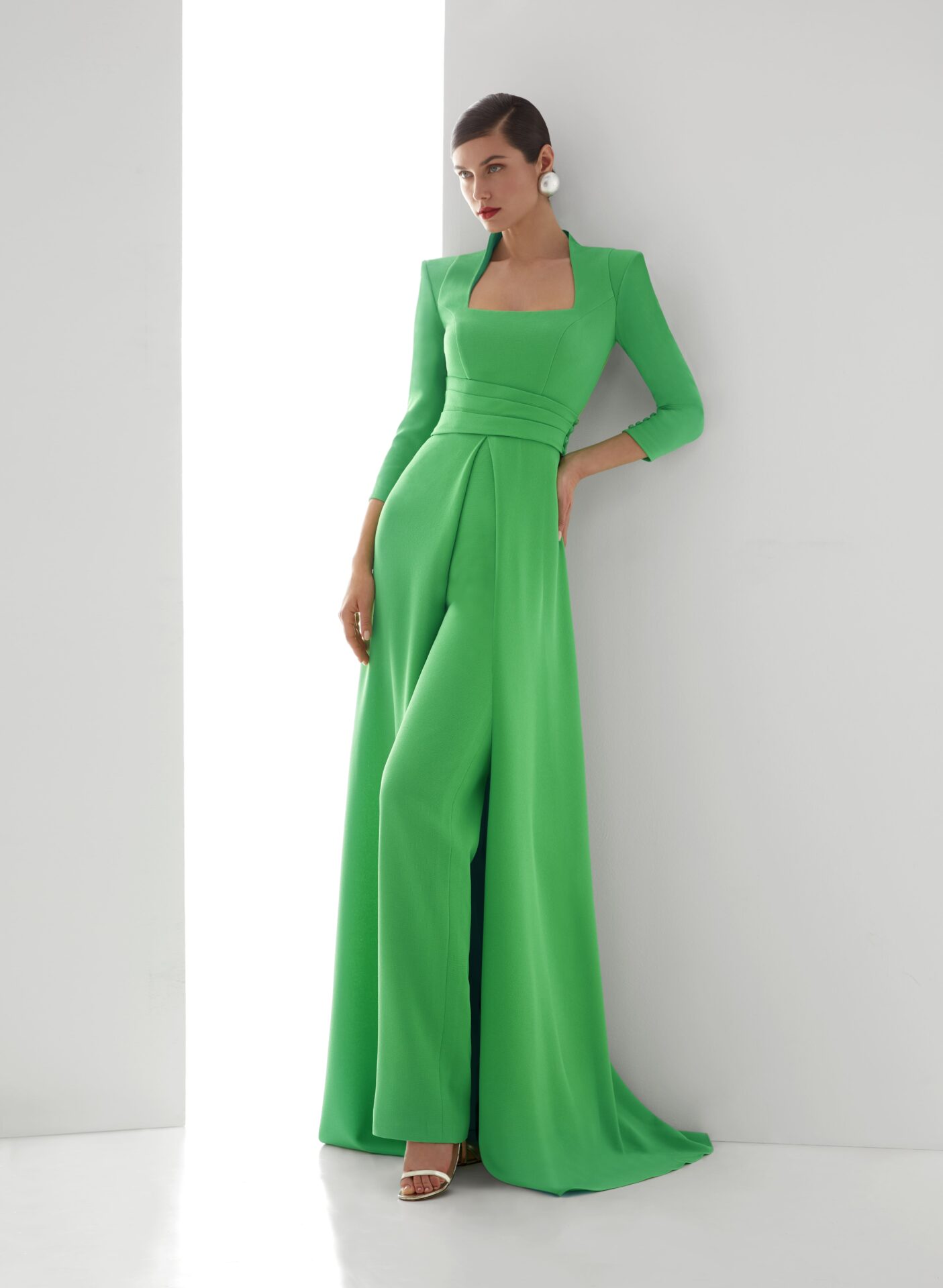 Luce sofisticada con este mono de fiesta verde de líneas puras y escote cuadrado. Las mangas largas y el diseño entallado en la cintura realzan la silueta, mientras que el pantalón de pernera ancha añade movimiento y elegancia. Ideal para bodas de día o eventos de etiqueta que requieran un look moderno y distinguido.